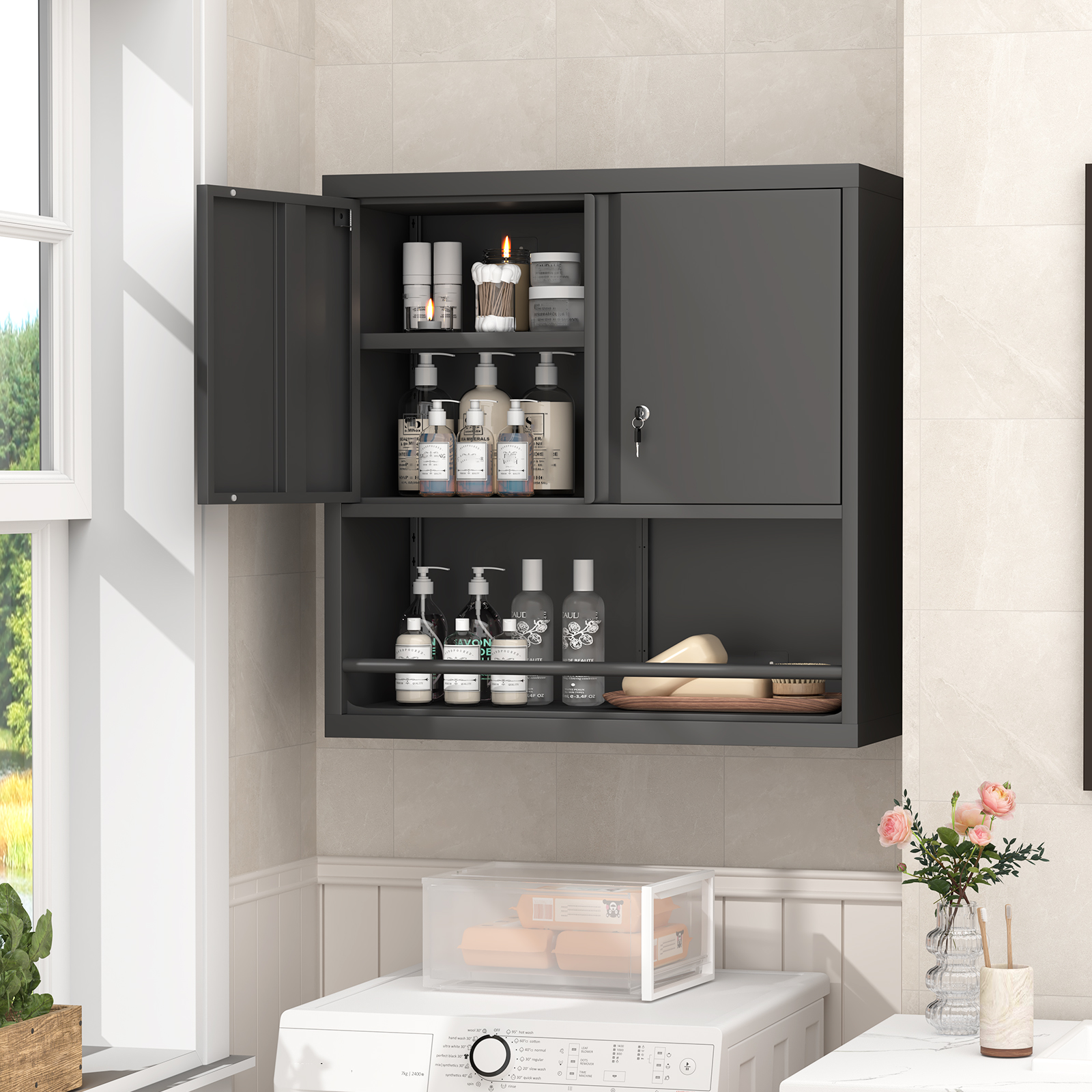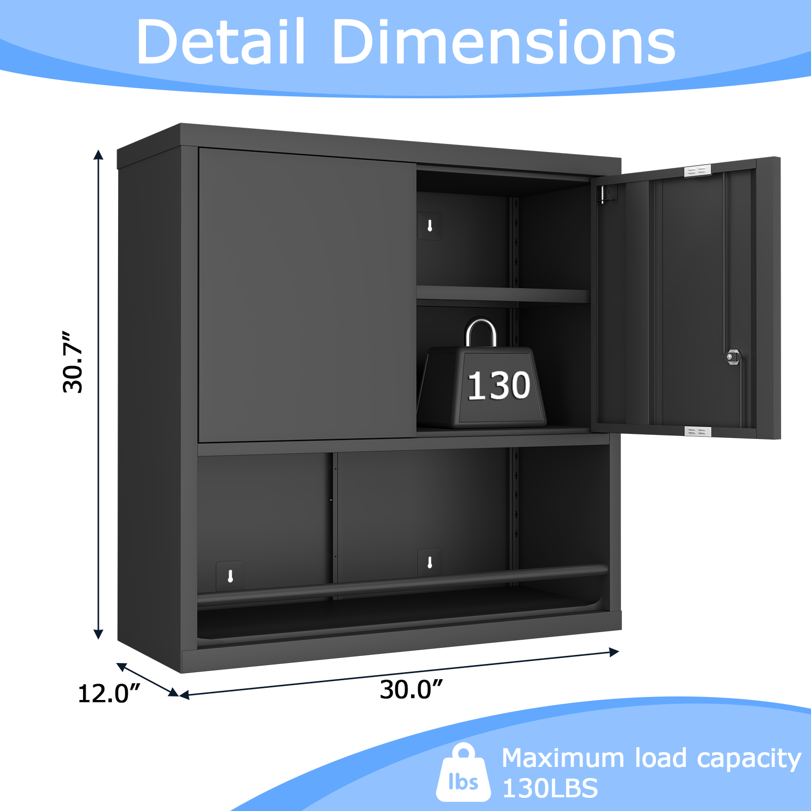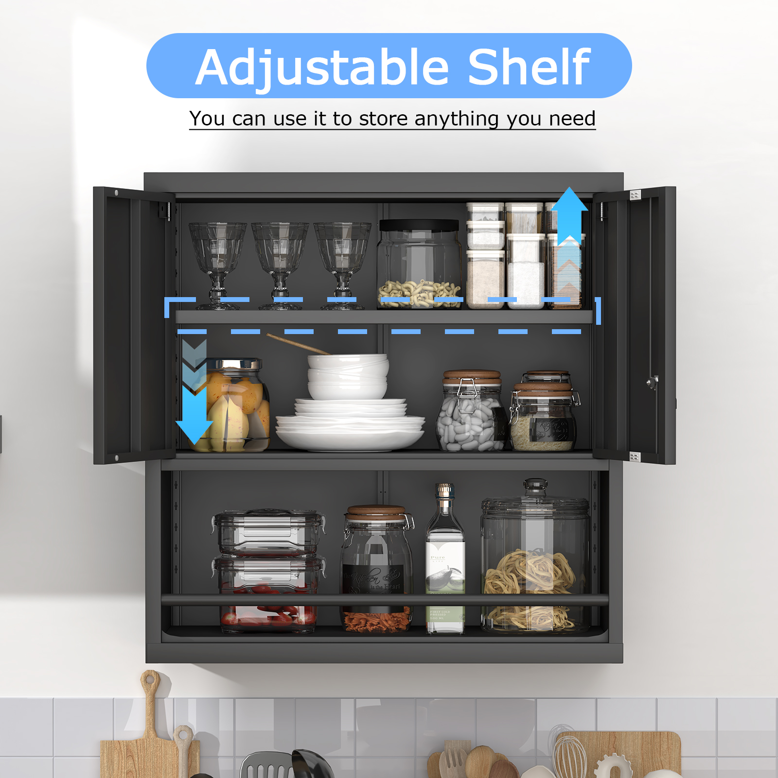 - Adjustable shelves allow for multiple height settings to accommodate various item sizes and optimize space usage. Made from high-quality steel, this modern cabinet that mounts on the wall merges stylish design with resistance to stains and corrosion, making daily upkeep a breeze. Its double-door structure includes a versatile modular interior with adjustable shelves and compartments, catering to various storage requirements, whether for kitchen items or office materials.